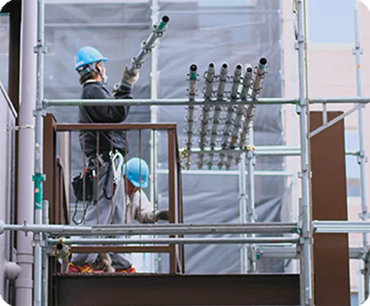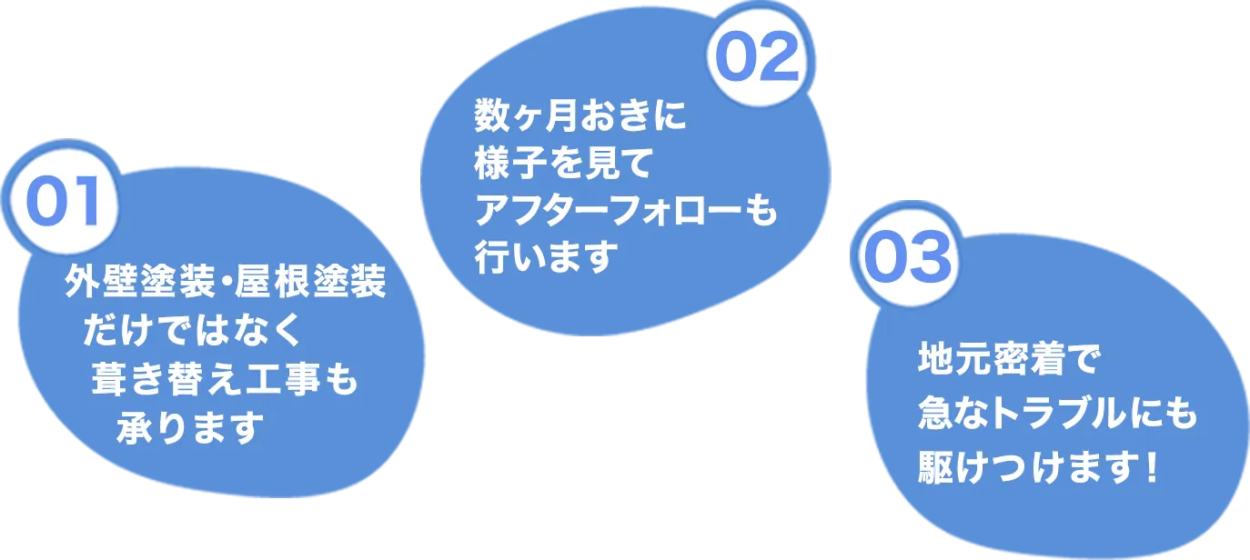外壁工事はもちろんのこと、気づきにくい屋根の補修や水周りの内装工事なども、状況に応じて対応します。塗料も経年劣化しづらい丁寧な施工を行わせていただき、施工後も様子をお伺いして、お住まいが常に快適であるような分かりやすいご提案をさせていただきます。